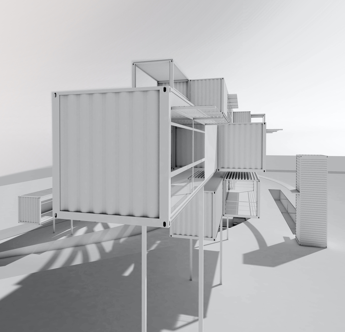 All these spaces and levels are distributed vertically by two containers of 53′ and horizontally by curved and covered passageways, closed on demand.
