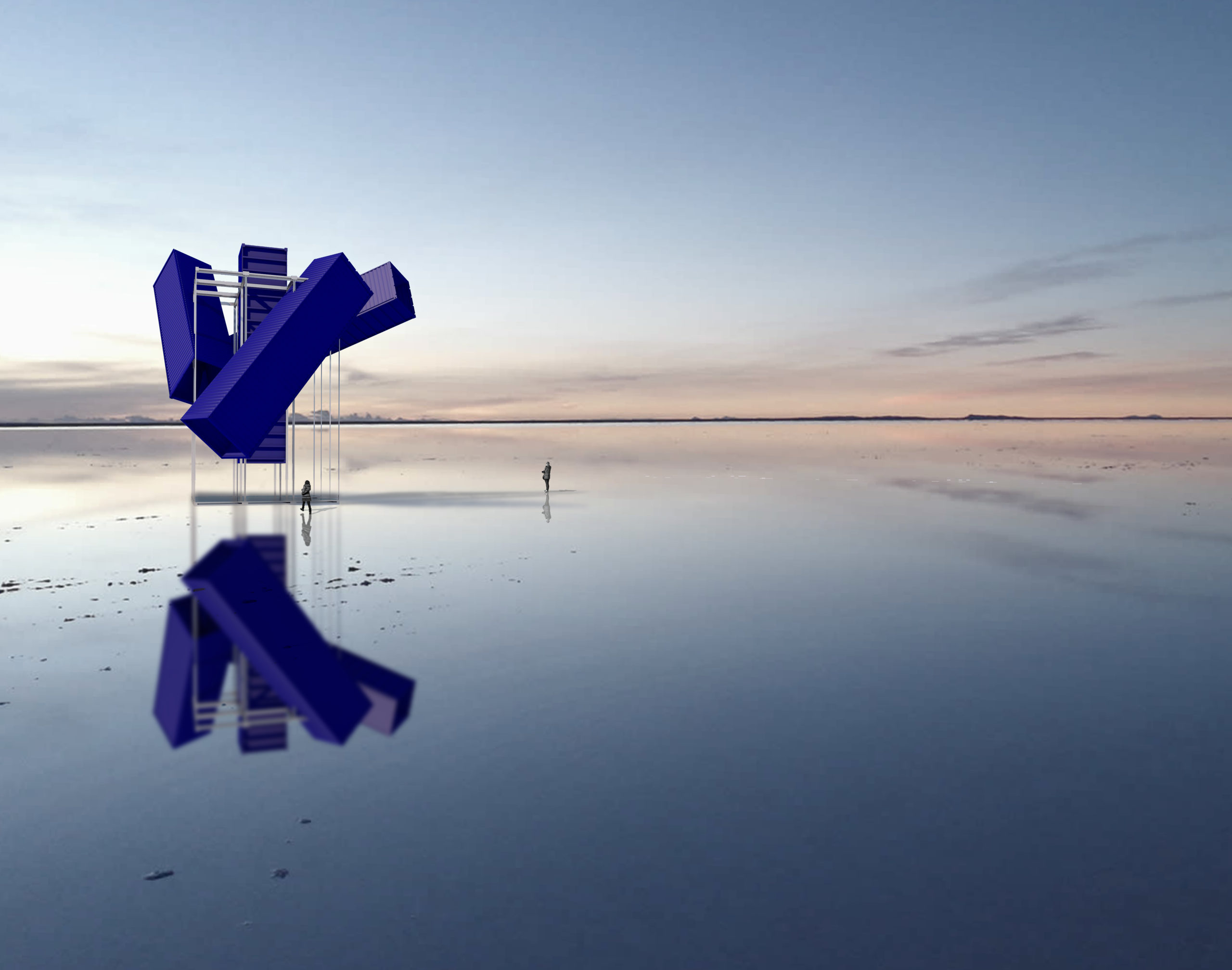 This structure, in its basic format, is made of a framework of 7 (month) frames with the dimensions of the containers of 40′ High Cube and 4 (day) containers of 40′ High Cube. These containers are fixed but due to their positioning in space, they seem to be swirling in the air. Finally, the 4 numbers – 1, 7, 7, 6 (year) – are cut in stainless steel plates and hung inside the containers that look like telescopes pointing towards the sky.