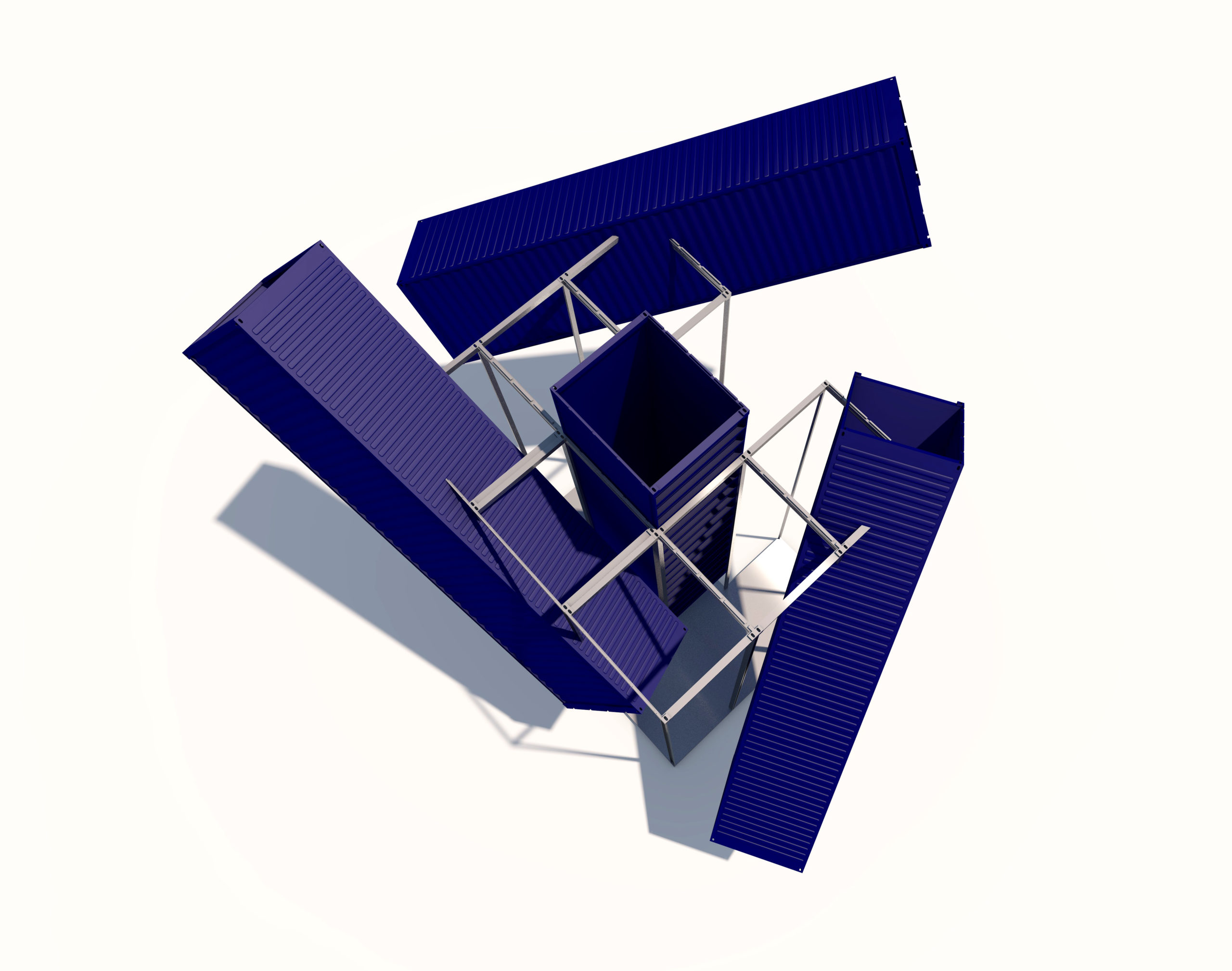 For this, a survey of the chosen site will be done with a maximum of details: history of the location, neighboring urban axes, neighboring structures, geographical orientation, prevailing winds, other natural constraints, etc. With this technical dossier in hand, we will be able thus to define the different elements that will make indeed each structure a unique one: slopes of the 4 containers; materials for the floor, structure and containers coverings; colors and marking; lights and sounds.